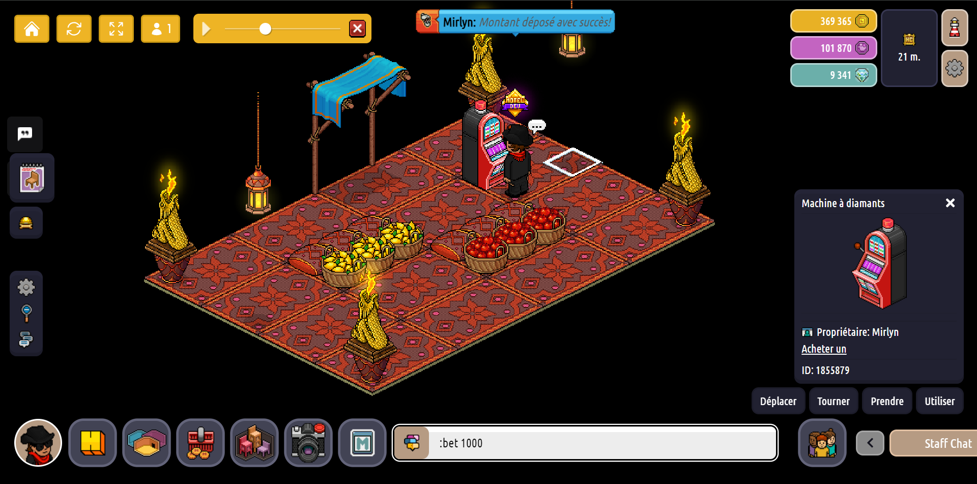 Ensuite dans un deuxième temps, une fois ton dépot inséré dans la machine à sous dédiée à cet effet, tu devras utiliser la commande :bet (montant) pour miser sur la machine à sous.